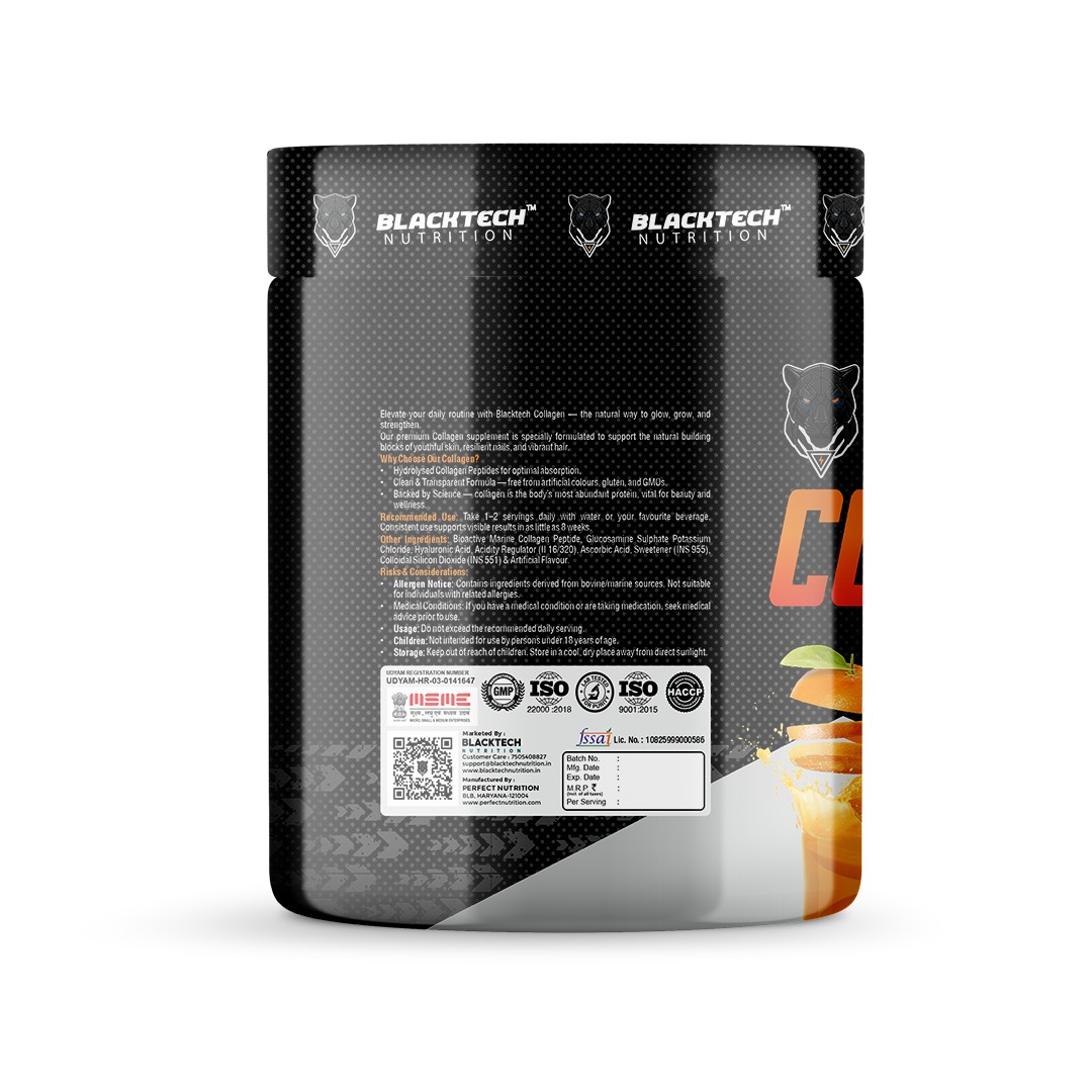 Blacktech Nutrition Collagen is a premium hydrolyzed collagen peptide supplement designed to strengthen joints, support bone health, and enhance skin elasticity. Positioned as a versatile wellness product, it appeals to athletes, professionals, and everyday consumers seeking recovery, mobility, and anti-aging benefits. Its clean formulation, fast absorption, and easy mixability make it a scalable addition to Blacktech’s product portfolio, reinforcing brand credibility in performance nutrition and holistic wellness.
