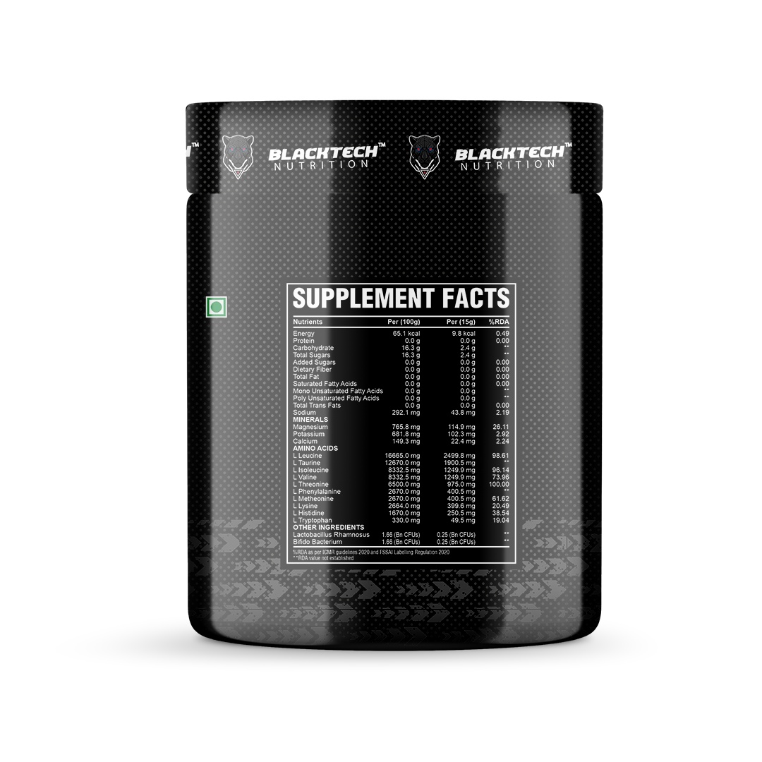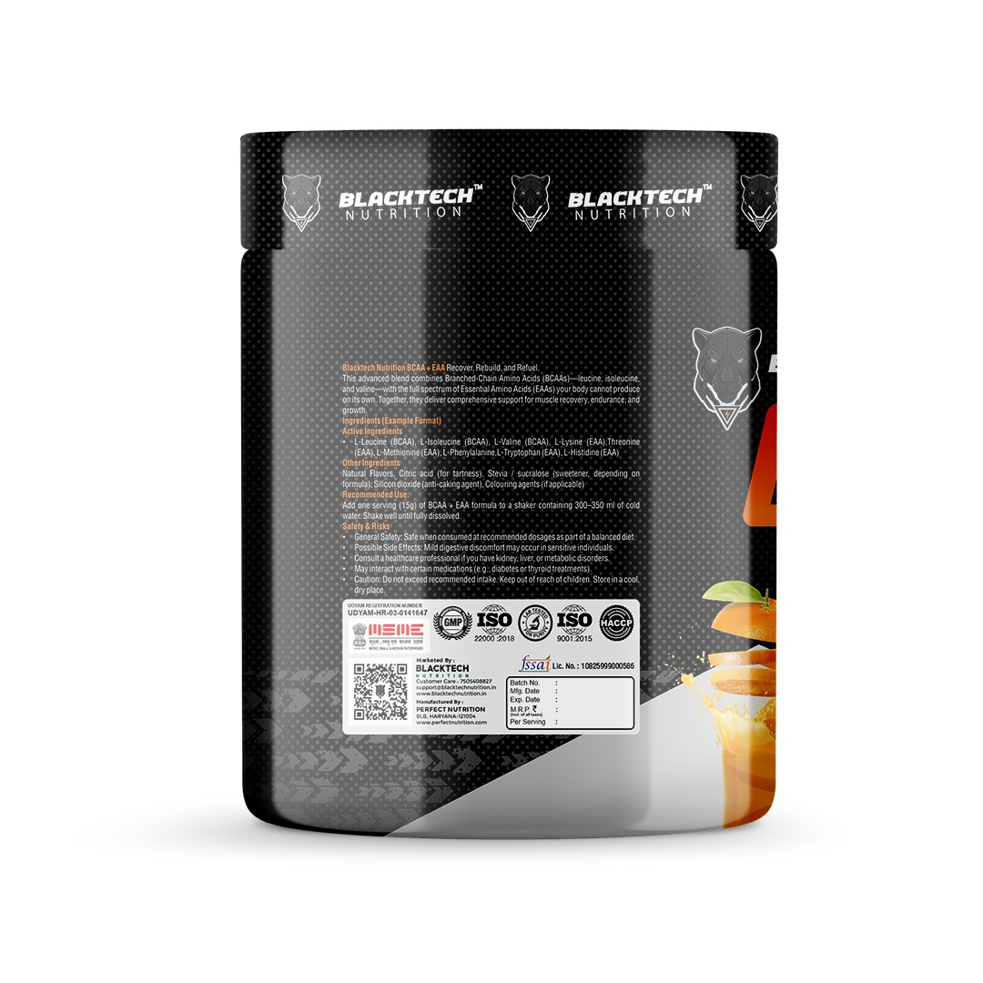 Blacktech Nutrition EAA + BCAA is a scientifically formulated intra-workout supplement designed to maximize muscle repair, endurance, and hydration. Packed with all nine Essential Amino Acids (EAAs) plus Branched-Chain Amino Acids (BCAAs), it delivers the complete building blocks your body needs to recover faster and perform stronger.