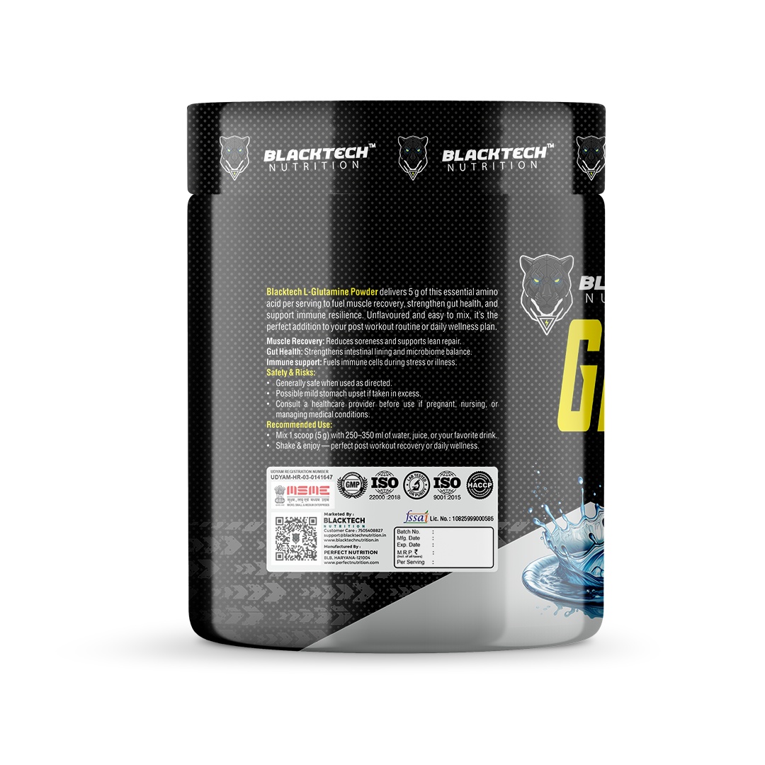 Blacktech Nutrition Glutamine, a premium-grade supplement designed to support muscle repair, reduce fatigue, and boost immune health. Formulated with 100% pure L-Glutamine, this powerhouse amino acid helps athletes, fitness enthusiasts, and everyday performers bounce back stronger after intense training sessions.