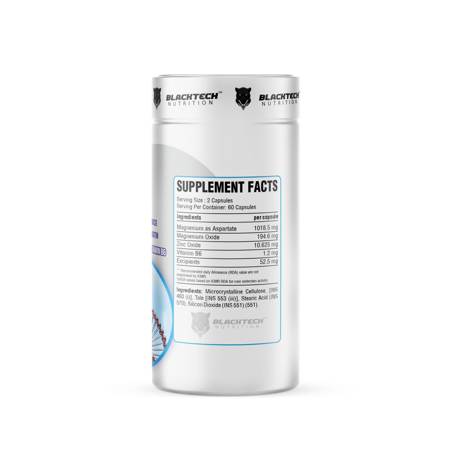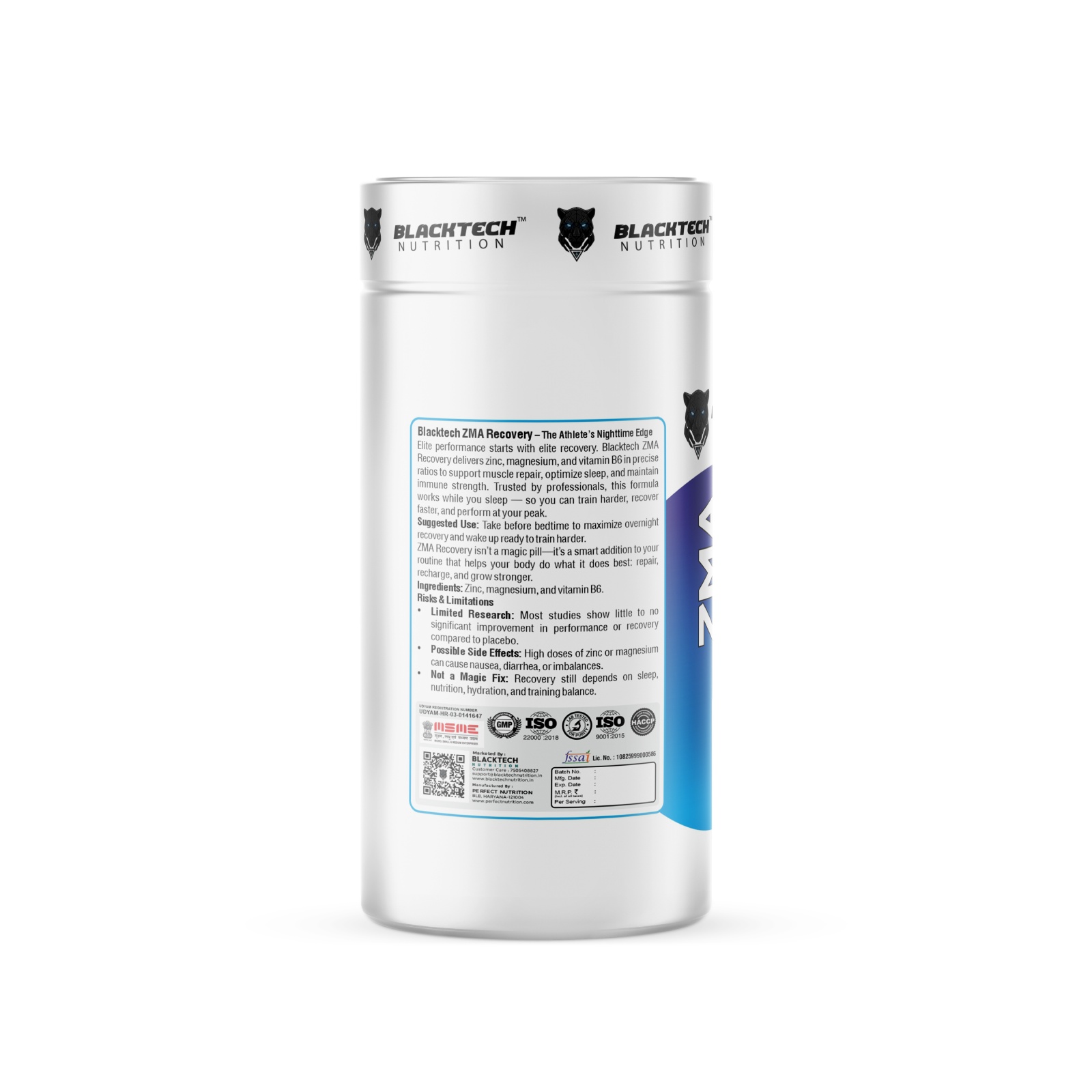 Blacktech Nutrition ZMA Recovery delivers advanced nighttime support with Zinc, Magnesium, and Vitamin B6. It promotes restful sleep, accelerates muscle recovery, balances hormones, and strengthens immunity — helping athletes wake up recharged and ready to perform.